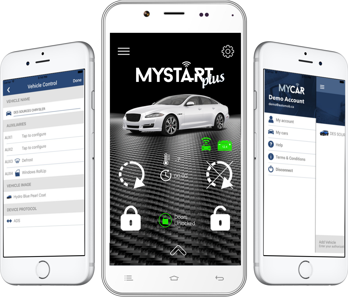 *Lorsque utilisé dans un véhicule situé dans la zone de couveture et en conjonction avec un démarreur à distance iDatastart. La fonction de localisation GPS requiert l'ajout de pièces additionnelles et sont forfait est d'une durée de 5 ans. Pour en savoir plus sur la zone de couverture, visitez www.mycar2.ca. Le système MyCar2 est couvert par une garantie d'un an.