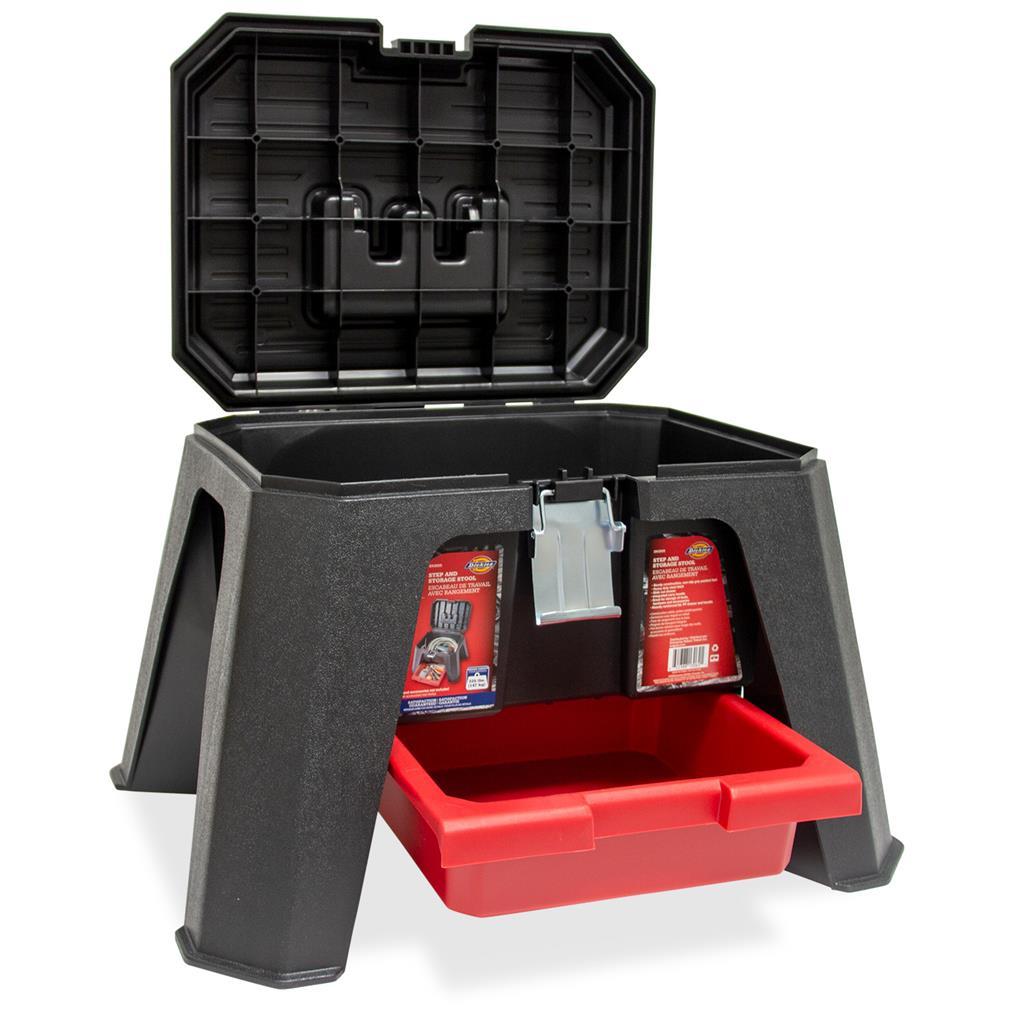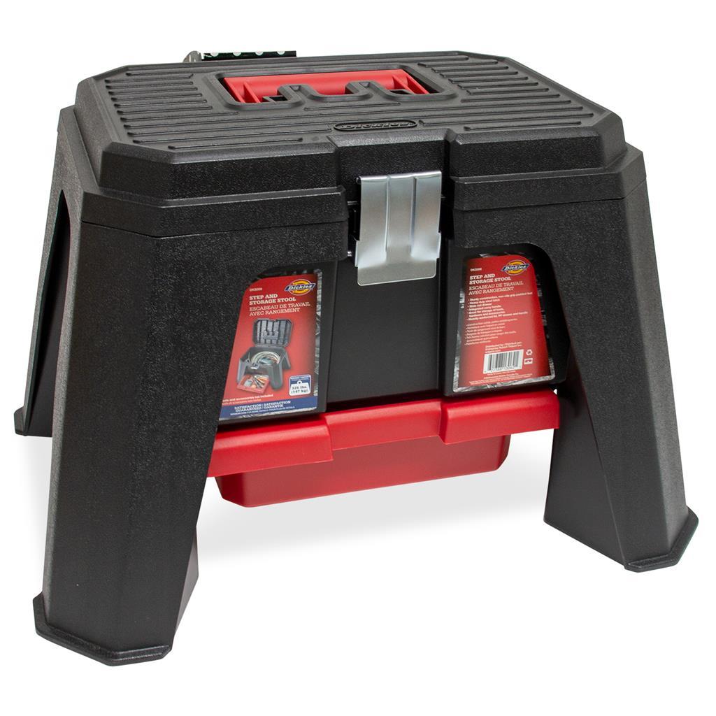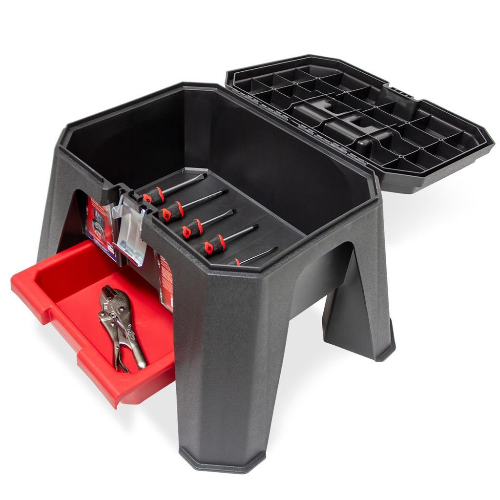 Construction solide, pattes antidérapantes Poids maximal: 325lbs Fermeture avec loquEt en metal Tiroir de rangement sous le banc Poignée de transport intégrée Très bonne solution pour ranger des outils, accessoires et quincaillerie Plateforme renforcée.